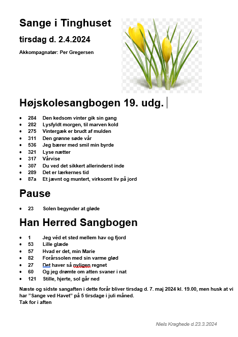 Velkommen til sangaften på Tinghuset. Aftenens akkompagnatør er Per Gregersen, og aftenens oplægsholder er Niels Kraghede.